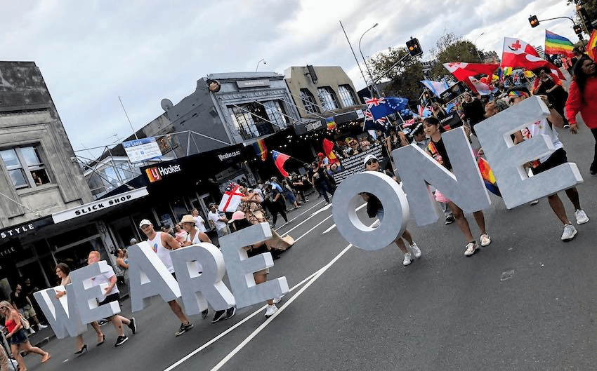 Glance at photos from the two events side by side and you might think you’re looking at the scenes from the same parade. Both take place under the sticky February Tāmaki Makaurau sun. People are waving rainbow flags, smiling and laughing. The overwhelming mood is one of celebration, joy, unity. A defiance of a traumatic history, striding into a better future.