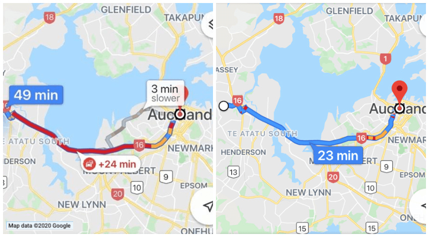 The first image below is from 9 March 2020, the second from 20 May, both at about 7:45am during the morning peak travel period. On a typical pre-pandemic morning, the trip along the Northwestern Motorway from a home on the western edge of Te Atatu South to the Auckland CBD could take as long as 49 minutes. During the lockdown it got as low as 17 minutes. Now, as we emerge from lockdown, the travel time is starting to grow once more.