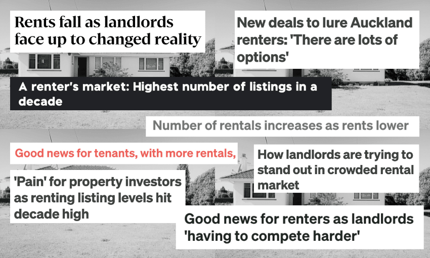 Similar articles followed. In March, word on RNZ was that landlords were sweetening the deal with $500 grocery vouchers or a free week’s rent. A property manager suggested homehunters could try asking for a discount. In April, landlords were in “pain” as Trade Me data showed property listings hit a 10-year high and nationally, the median rent was down by 2.3% year-on-year. In the press release, Trade Me Property customer director Gavin Lloyd said people looking for rentals should feel empowered, “tenants have more negotiating power than they have had in years.” A property investment coach told RNZ that “we have a renter’s market,” and 1News also used the term.