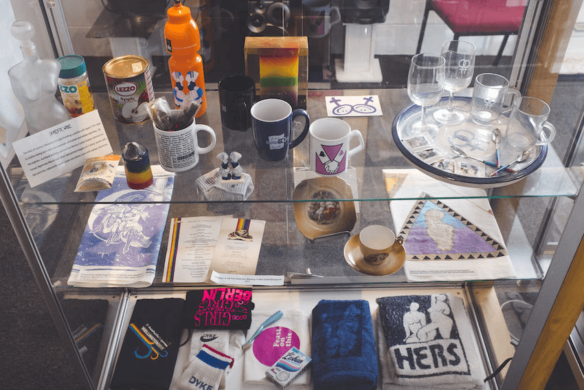 The stories of women like Charmaine and Sue are told at the domestic ware section. Behind glass is a pair of “hers and hers” towels, plates and wine glasses decorated with the double Venus sign, and a Lezzo tin of apple tea “that all the [lesbian] households tended to have in the 70s and 80s”, according to Saphira. “I don’t know whether anyone drank it.”