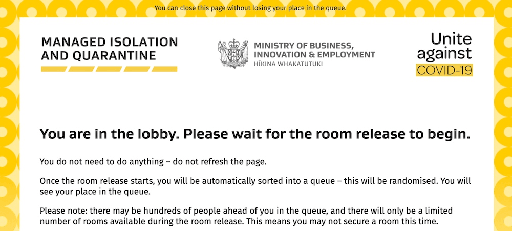 I went to the website, entered my passport number, and was transported into the virtual lobby. Over the next hour — until 9am New Zealand time — other people arrived to join me in the lobby. It didn’t matter when you joined over that hour — you just had to be in there by 9am.