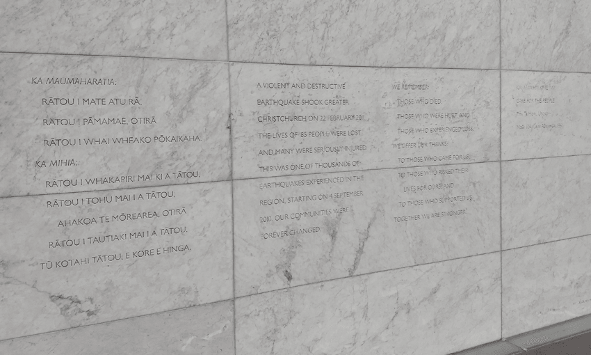 The official earthquake memorial – Oi Manawa, which means “tremor of the heart” – was opened in 2017. It is also beside the Avon, just a stone’s throw from the CBD, but tucked away from the shopping. At the top of the ramp, on a stone base adorned with whakairo, stands a huge piece of pounamu running with water from a hidden pump. This gift from Te Rūnanga o Ngāi Tahu marks the threshold. Descending, an imposing wall visually separates the sombre memorial from the space of everyday life above. This is something common to Pākehā approaches to grief – this cordoning off of space and time, an assumption of grief as private, rather than public. The sort of assumption that’s challenged when trauma and loss are shared by an entire city.