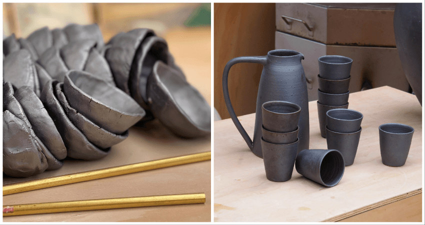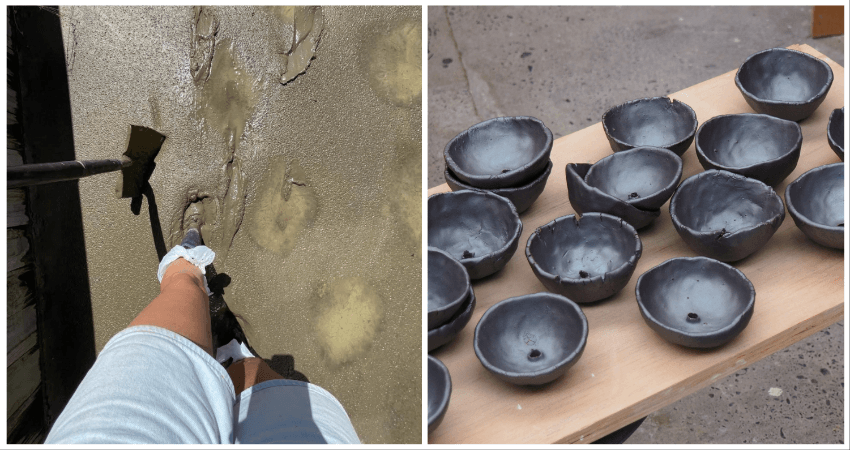 Morgan did a test firing in the kiln using the silt as a glaze, and was impressed with the “consistent” results. Adding a little bit of iron to dramatise it, she fired the community pinch pots in the kiln and was astounded to find the “most amazing purpley blush colour”. Now, she plans to string them together to make a rain chain, a water feature that can replace spouting on buildings. “The rain runs into it and then it goes to the next one and then the next one, all the way down,” she explains. “It makes the most amazing sound when the rain is tinkling down.”
