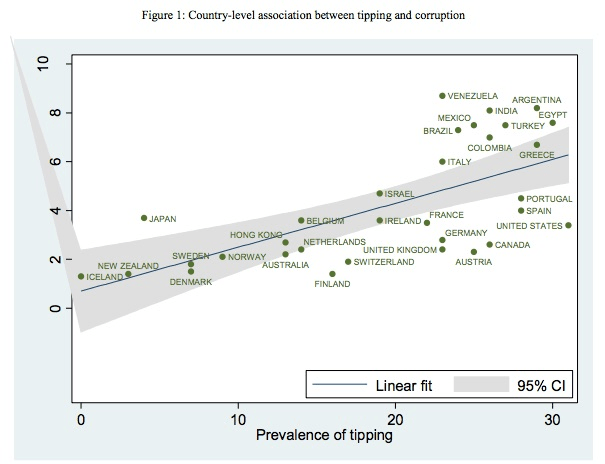 Not enough for you? How about corruption? Cultures that tip have higher instances of corruption. Which makes sense. If you’re accustomed to thinking that leaving small amounts of cash on a dining table results in better service, why shouldn’t you be able to slip other people larger amounts of cash to obtain advantages more nefarious than quick water refills?