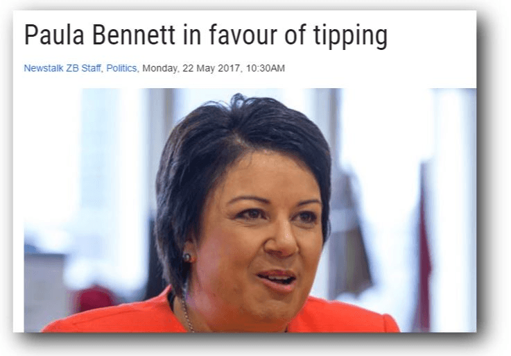 Newstalk ZB is reporting that tourism minister and deputy PM Paula Bennett is “going public to show her support for tipping”, and has written a letter to Newstalk’s media sibling the Herald saying that while service is New Zealand is good, we need tipping to make it better.