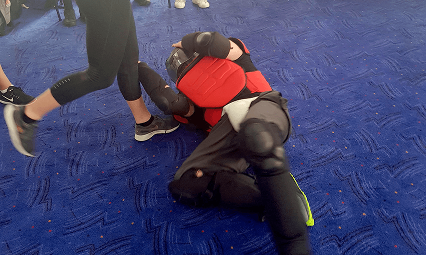 When he relented and fell to the ground she followed his movements and punted him in the head, striking his back and his kidneys as he rolled away, before running to safety across the room. Instructor Phil Thompson, New Zealand’s most eminent self-defence expert, removed his helmet and looked at me with a ‘holy shit’ look on his face, nursing a bruised behind. The class applauded.
