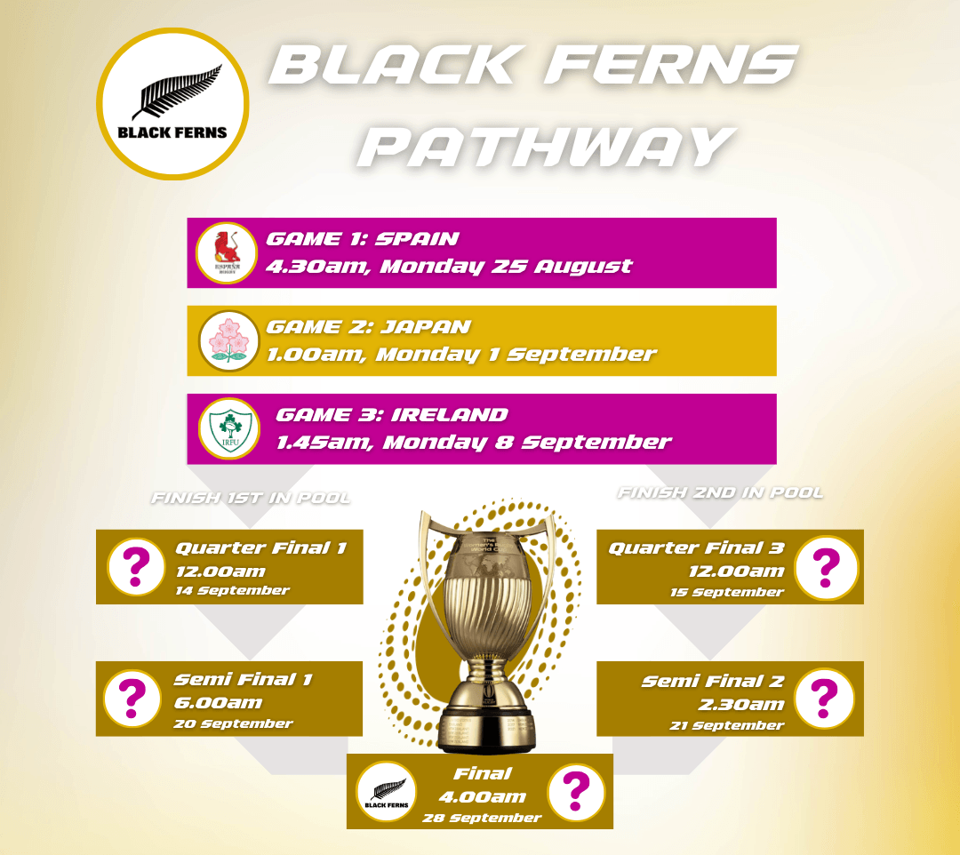 England time zones mean it’s time to update the old script about getting up in the middle of the night to have a milo and watch the All Blacks with a caregiver. Now you will be setting your alarms for our Black Ferns as they chase their seventh(!) World Cup title.
