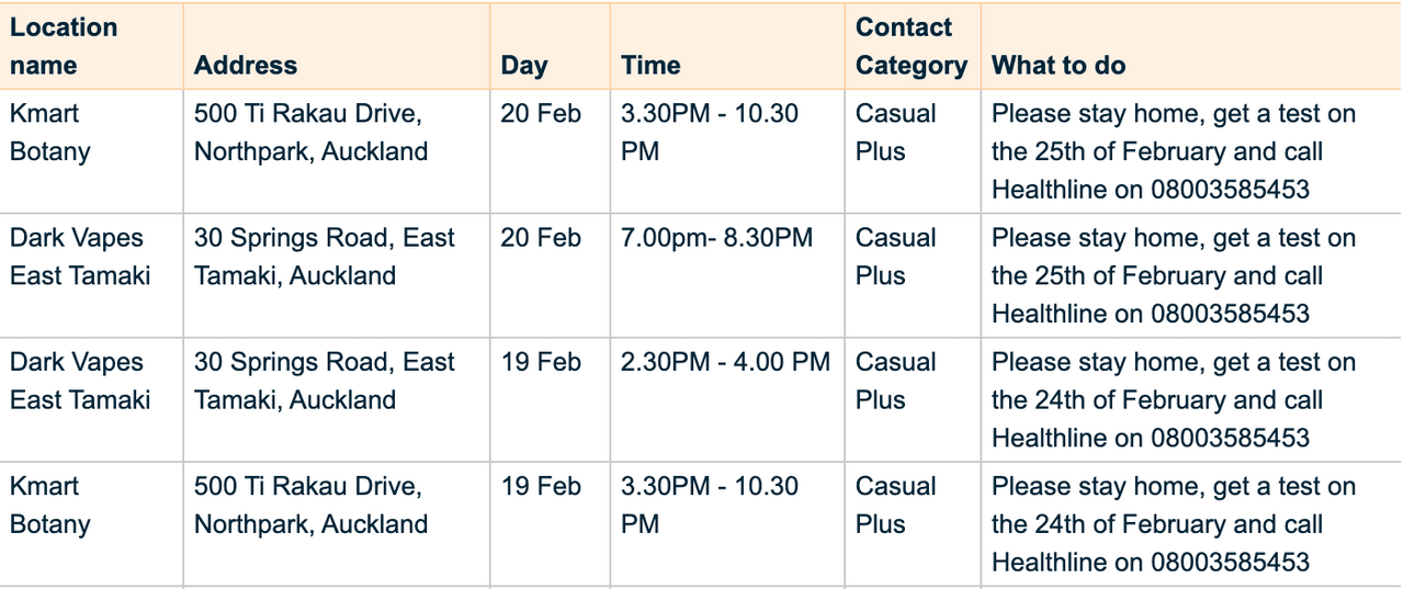They are: Kmart in Botany Downs and Dark Vapes in East Tamaki. Anyone who visited these sites at the specified times is considered a “casual plus” contact and should remain isolated at home.