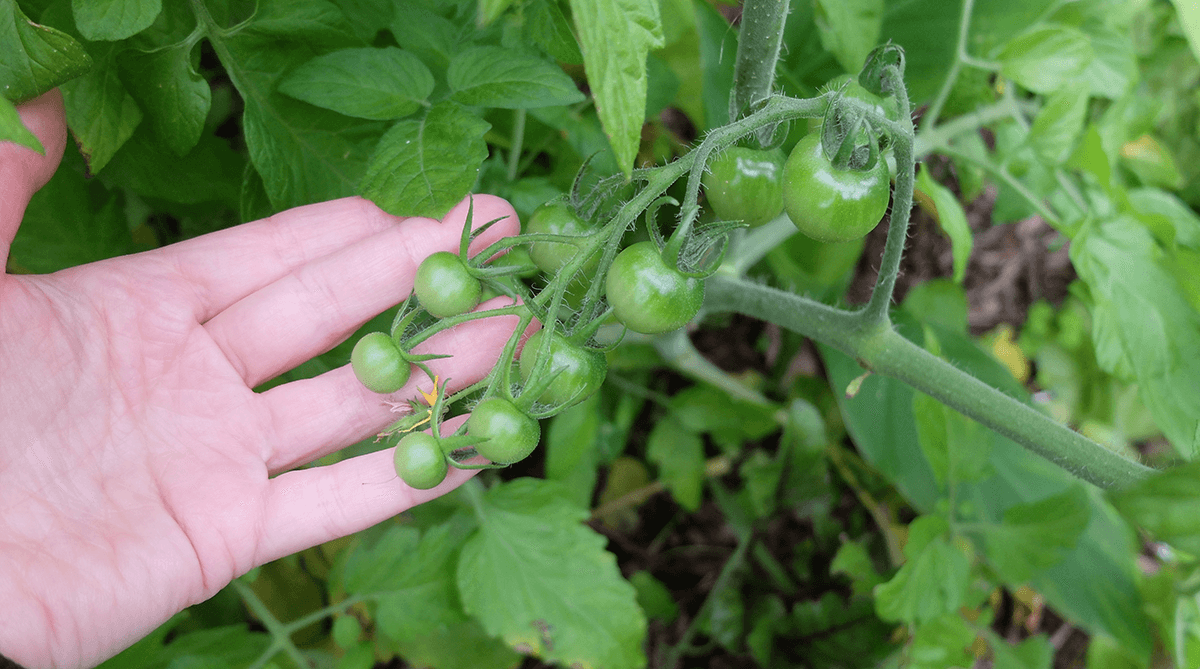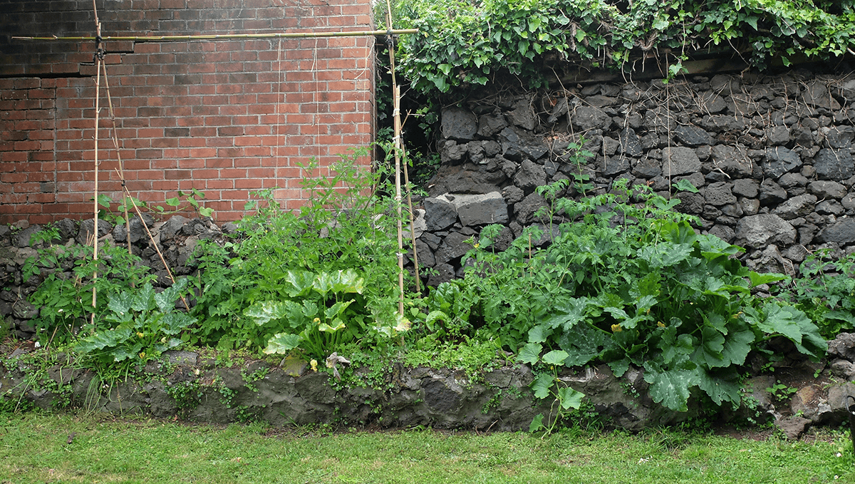 The tomatoes are hard, green, shiny globes. Ten droop off a frond, arranged in order of size. They are sweet-smelling perfection. A bean vine has understandably fallen in love with a tomato branch, and is clinging on as it forms delicate white buds. In front of them the zucchini is experiencing a mildew outbreak, but is still bearing flowers and fruit (“me,” I think, as a dermatitis flare creeps up my neck). Over on the side of the bed, silverbeet clusters are dense with juicy leaves.