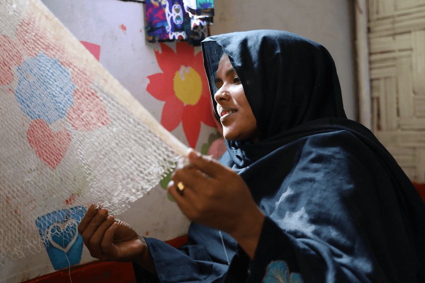 Or Sakina, who told me that it took seven days to reach Bangladesh with eight members of her family, including her husband who has a disability due to being a victim of violence. Life is difficult, she said, but she’s happy to have learnt how to make fishing nets at the community centre run by the Bangladesh Red Crescent Society (the Bangladeshi version of the Red Cross).