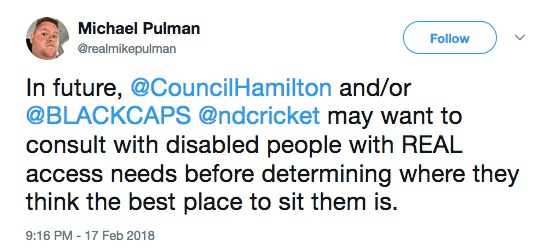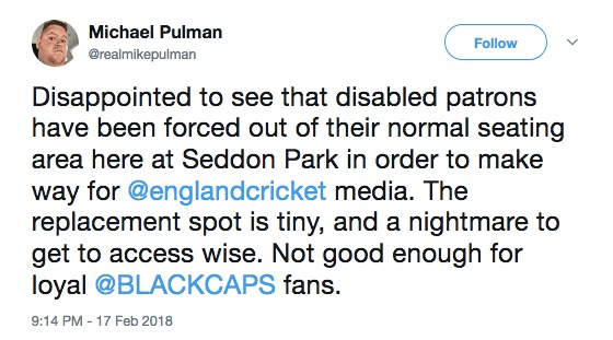An outcry over the treatment of disabled patrons at Hamilton’s Seddon Park during a recent Blackcaps match could have been avoided with just a bit of prior communication, says sports writer and disabled person Michael Pulman.