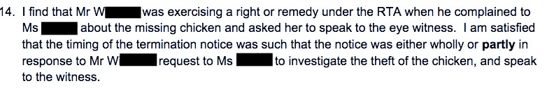 Mr W thought the notice was “in retaliation for complaining about the chicken being stolen”. The Tenancy Tribunal agreed and dismissed the termination notice as invalid. The decision doesn’t say whether the perpetrator of crime was ever found and brought to justice.