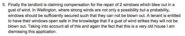 The audacity of Quinovic trying to pull this claim on a 100-year-old house in Wellington – a city the Tribunal described as “where strong winds are not only a possibility but a probability” – is awe-inspiring. Logic prevailed and the claim was dismissed. The landlord also tried to claim $500 of the former tenants’ bond back for cleaning, but the tribunal said the place was “reasonably clean and tidy” apart from a couple of drawers so instead deducted $20 from the bond to cover that.
