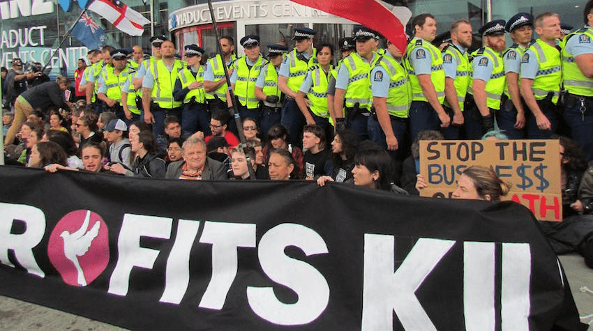 Official Information Act requests have revealed that the police alone spent in excess of $100,000 providing security for the two day conference in 2017, and it seems that there is a deep well of resources to shut down the protest this year. All of this is in spite of widespread and consistent community opposition to the business of war.