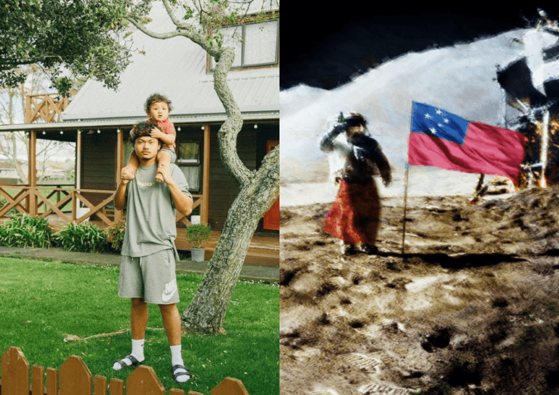 Matautia’s exhibition piece, ‘Bungas and Beyond’, is a replica of the famous photo of the first steps on the moon in 1969. But Matautia has added his own twist, swapping the American stars and stripes for a proud Sāmoan flag. “The piece was to show PI’s [Pacific Islanders] that they could do whatever the fuck they want,” he says. “Like, because we’re loud and proud, you can go to the moon, put the Sāmoan flag on the moon and come back.”