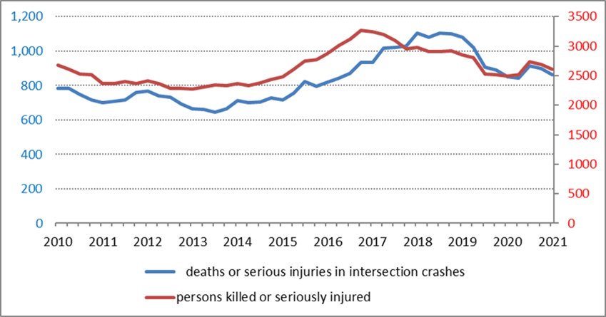 Asked for data on the impact of the change, Waka Kotahi provided the chart below, which shows a decline in deaths or serious injuries at intersection crashes of around 15% from the start of 2012 to the start of 2013, and a fall in the proportion of serious traffic accidents that took place at intersections. Whether the give way change is to thank for that is another question, and recent years suggest there is plenty of work still to do at the places roads meet.