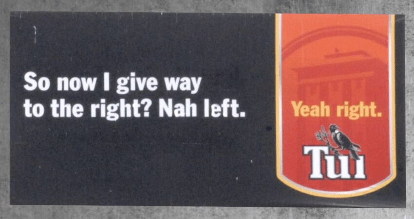 Versions of those ads were the centrepiece of a $1.2 million TV campaign. Leaflets were delivered to 1.7 million homes. A poster advertising the change appeared on a Ferndale wall in Shortland Street. A Tui billboard got in on the act. “So now I give way to the right?” it read. “Nah, left.” Across talkback radio, social media and in appeals to parliament, however, the sound of resistance was heard.