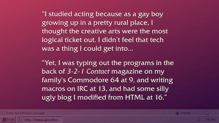 My private journey was a little different, and it wasn’t something I really talked about in public. I’ve always been a giant nerd. I’ve loved computers and what we can do with them since I was ten years old.