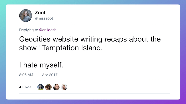 But always, ALWAYS, these things were in secret, because it was embarrassing and deeply uncool. I lived in fear that someone would “find out” that this is what I spent my spare time doing online. That I’d accidentally print something I’d written to the office printer, or send a friend an email logged in to the wrong account.