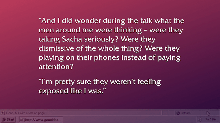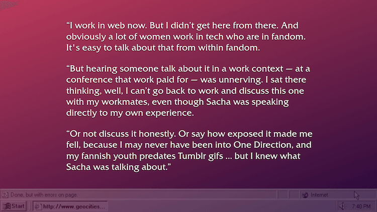 This is a blog post someone wrote after seeing my talk at Webstock – and this hit me right in the gut. I don’t who this is, but she writes about how seeing me talk about fandom in a work context left her feeling unnerved. How she didn’t feel she could go back to her work and chat to her colleagues about it.