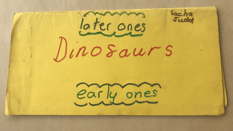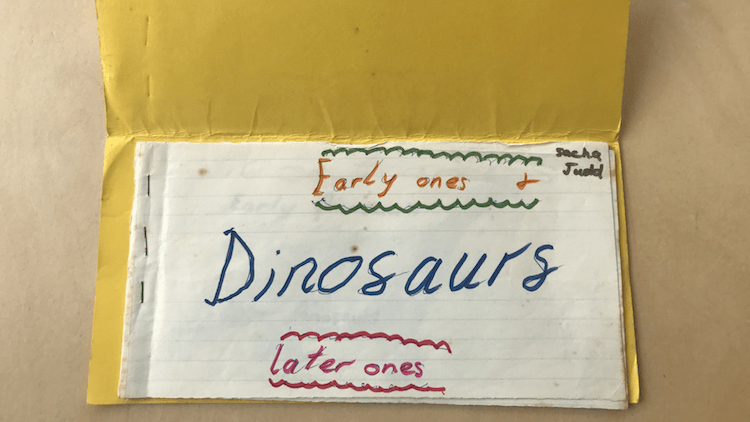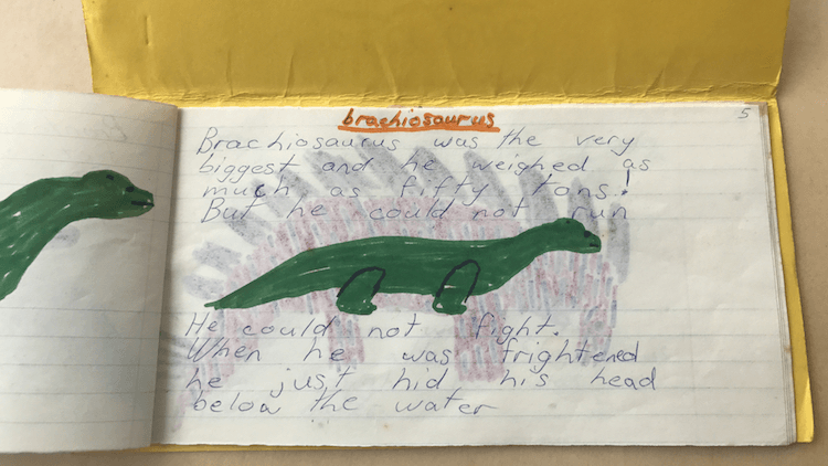 Mine was dinosaurs. Here’s the first book I wrote. It’s a non-fiction masterpiece, because it covers both later ones AND early ones.