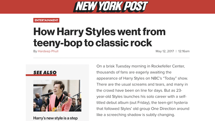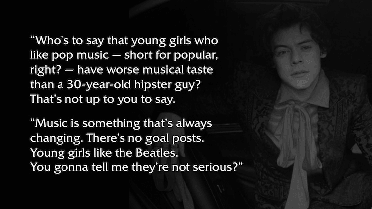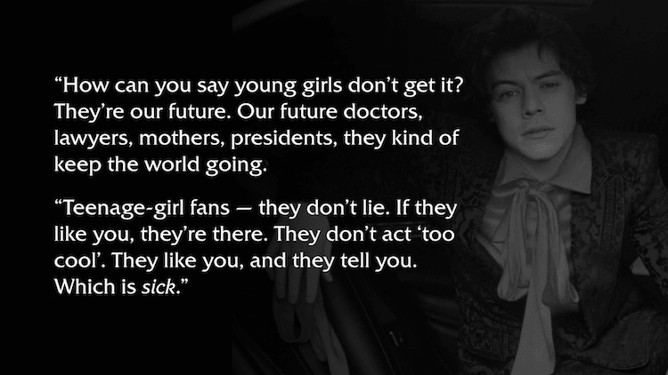 So we create this “hierarchy of cool”. Liking One Direction is embarrassing. Liking Harry Styles’ solo album, on the other hand, might be okay. Because he’s leaving behind the “teen girl hysteria” that followed him around like a “screeching shadow”.