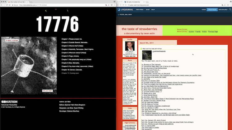 Here’s an example I’ve been thinking about this week. Many of you will have seen the amazing interactive fiction project 17776 – What Football will Look Like in the Future, from Jon Bois. If you’ve not looked at it, that’s what you should do immediately on returning to work today. It’s this amazing project involving text and gifs and videos, telling the story of space probes who have gained sentience and are talking about what American football is like in the year 17776, when no-one dies and humans play football over hundreds of years and millions of miles.
