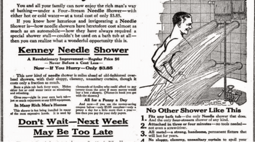 In the United States the shower, or “rain bath” as it was known, was a luxury only for the wealthy until the 20th century. Like the Kenny Needle Shower advertised in the New York Times in 1914 below, which shows a man seemingly enjoying the feel of the water spouts a little too much.