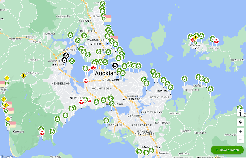 Safeswim, a collaboration between the Auckland and Northland Regional councils, Watercare, Te Whatu Ora, Surf Lifesaving NZ and Drowning Prevention Auckland, is one part of the solution: to stop people from getting sick, simply provide advice about when not to go in the water! The app and website use a mix of sampling and an algorithmic model to alert people in Auckland and Northland about the water quality at their local beach with a colour code system. Green means a beach is clean and the risk is low, red means there’s a high risk, and black means there’s a direct wastewater overflow affecting the water.