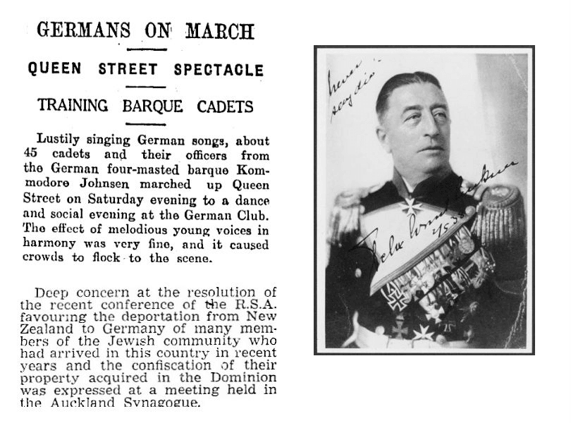 After they docked at Auckland in late January, the crew of the Kommodore Johnsen marched up Queen Street in their uniforms, singing Horst Wessel and Deutschland Uber Alles. The New Zealand Herald reported that the “effect of melodious young voices in harmony was very fine, and it caused crowds to flock to the scene”. A correspondent of the Waikato Independent visited the Kommodore Johnsen while it was tied up at Auckland, and noted that “practically every cabin” contained “a picture of Herr Hitler”.