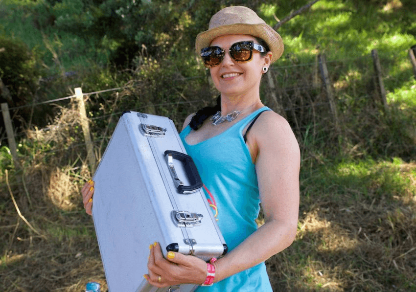 She arrived at our interview on the grassy bank behind the Splore mainstage carrying a solid silver briefcase – inside was the famous laser butt plug. It’s a surprisingly large and elaborate piece of equipment, and requires her husband to control the colour changes during the performance. It’s also top secret and I can’t show you a photograph, or tell you about how it is made.
