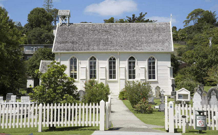 In the Bay of Islands close to the coast, where 200 years ago Māori traded food and timber for European goods, a sign proclaims “Christ Church, Russell.” A narrow path guides pilgrims past ageing graves with fading names towards a small white building – New Zealand’s oldest church. On one of the walls you can just make out where it was struck by a stray musket ball during a battle against the British in 1845. Inside, under stained glass windows, old kauri pews, row by row, lead to a modest altar. Outside an ancient olive tree gently sways in the wind. On a quiet day you can hear the waves.