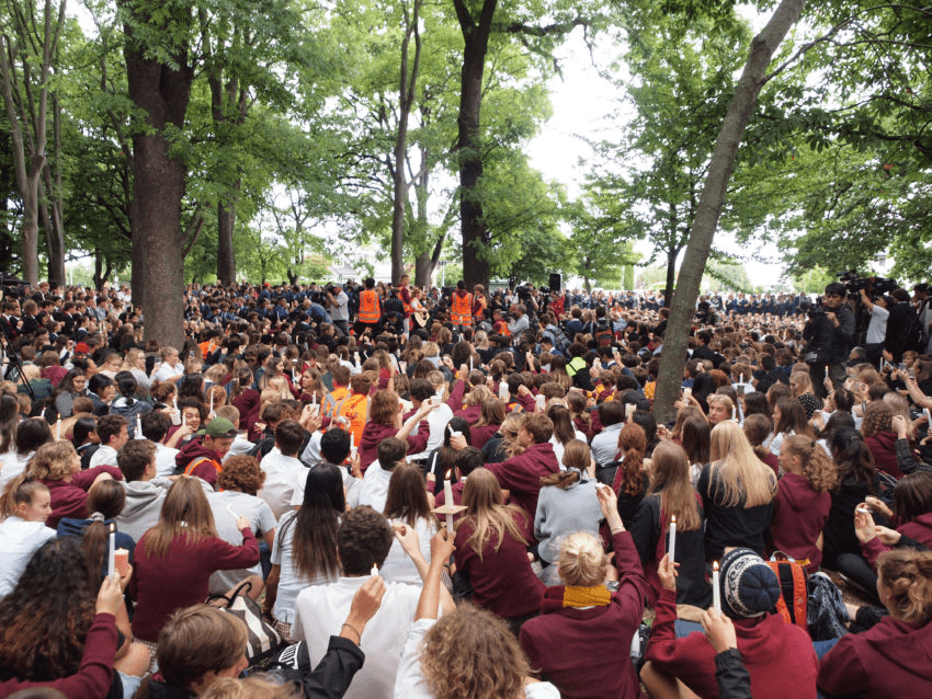 The official part of the ceremony itself was short. It ended with a candle being lit by the students in the centre of the huddle; from there the flame was passed outwards until all candles were lit. Then, after the candles were blown out, a handful of students stood up and started the haka. As if inspired by the flames cascading between the candles, more kids jumped up to join in – and then more, and then more. It was a remarkable sight, conveying the shared grief felt by the students of Christchurch, not only for the victims of the attack, but for the city itself.