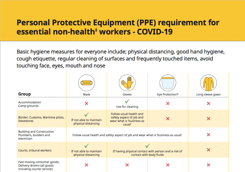 The Ministry of Health has now circulated updated advice on the appropriate use of PPE (personal protective equipment) for both healthcare professionals and other essential workers during the Covid-19 lockdown. This advice includes basic hygiene measures for everyone – hand washing and sanitising, physical distancing, cough etiquette, not touching the face and regular disinfecting of surfaces – but the government says not everyone needs PPE.