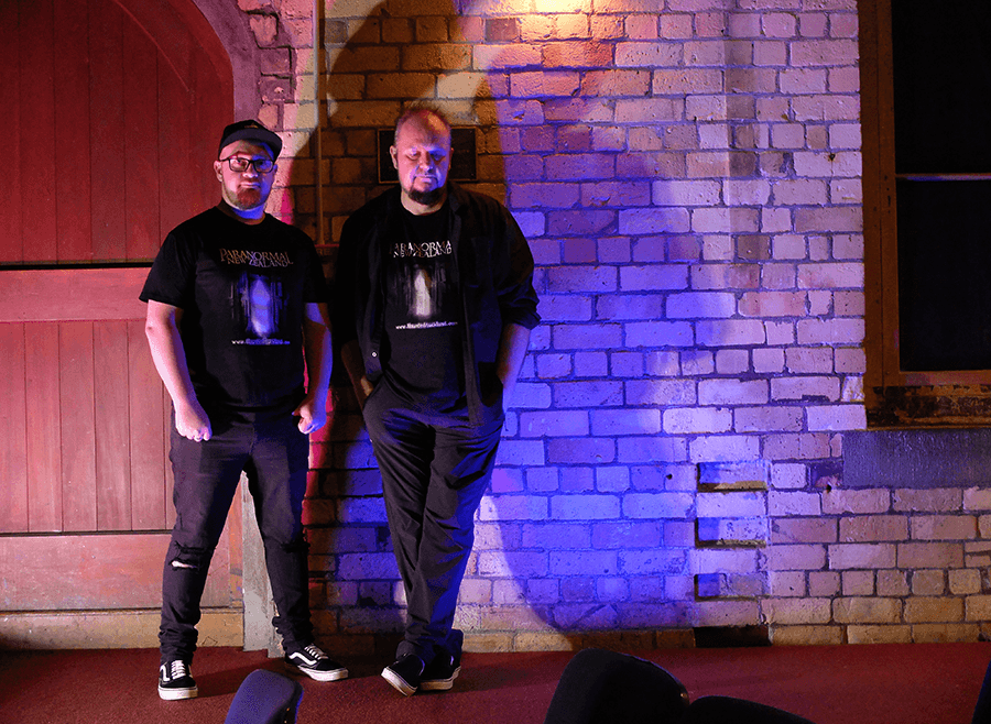 Tonight, we’re in Auckland’s PumpHouse Theatre with one of the group’s longest standing members, Sam Collier. At times, it’s hard to tell the two men apart. They are both wearing black pants, black Vans with white soles, matching black Paranormal NZ T-shirts with a ghostly white figure glowing on their chests, unbuttoned long sleeve shirts casually layered over the top, and somewhat meticulously groomed facial hair.