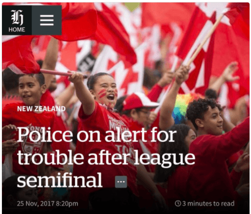 These are New Zealand Police website headlines: “No arrests at Tonga-Lebanon match” “Few policing issues at Tonga-Samoa match” “Police happy with crowd at NZ-Tonga match”. All of them indicate few incidents at the recent Tonga rugby league games played here in New Zealand. The mainstream media coverage, however, painted a different picture. Half an hour after Tonga’s semi final loss to England, police were apparently “on alert for trouble”. Yes, there were a few isolated incidents following games, but with tens of thousands of fans of all ages out celebrating, 50 arrests for disorderly behaviour, while disappointing, is hardly a suburb erupting into all out violence, as some media reports would have us think.
