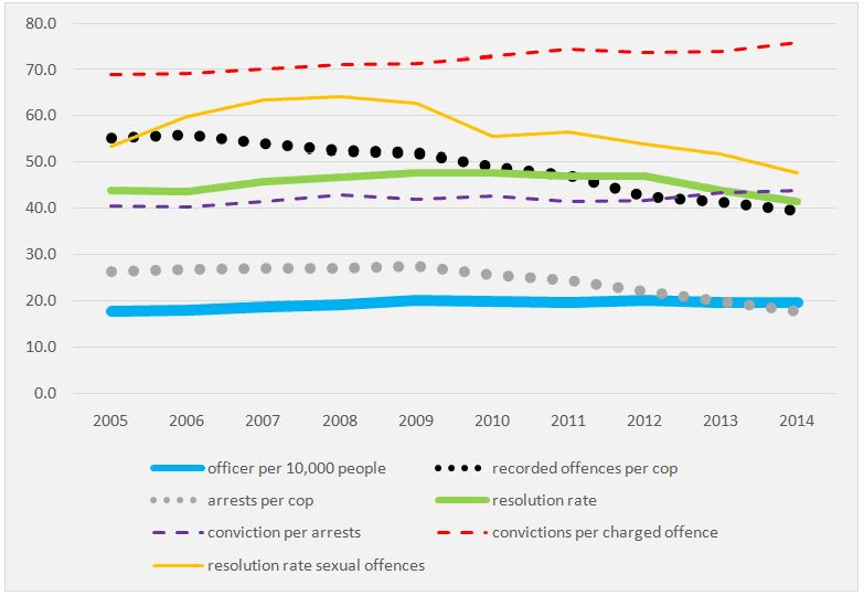 The black dotted line shows the number of recorded crimes per police officer and the grey dotted line shows the number of arrests made per police officer. Both run fairly parallel, which makes sense because fewer people should be arrested when fewer crimes are recorded. In other words, if the number of reported crimes goes up, each police officer gets busier. If the number of reported crimes goes down, police officers can dedicate more time to each case.