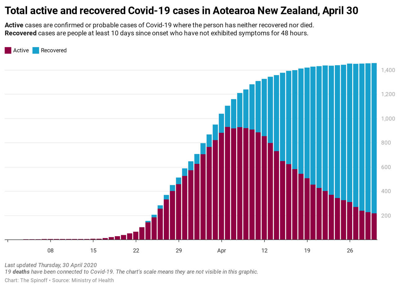 Here’s today’s graph, courtesy of Chris McDowall. There are 216 active cases, and 1,241 recovered. See McDowall’s data visualisations for yesterday’s numbers here, and check back later this afternoon for today’s full suite of graphs.
