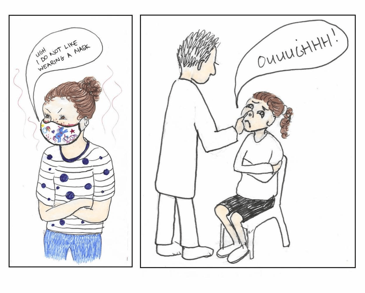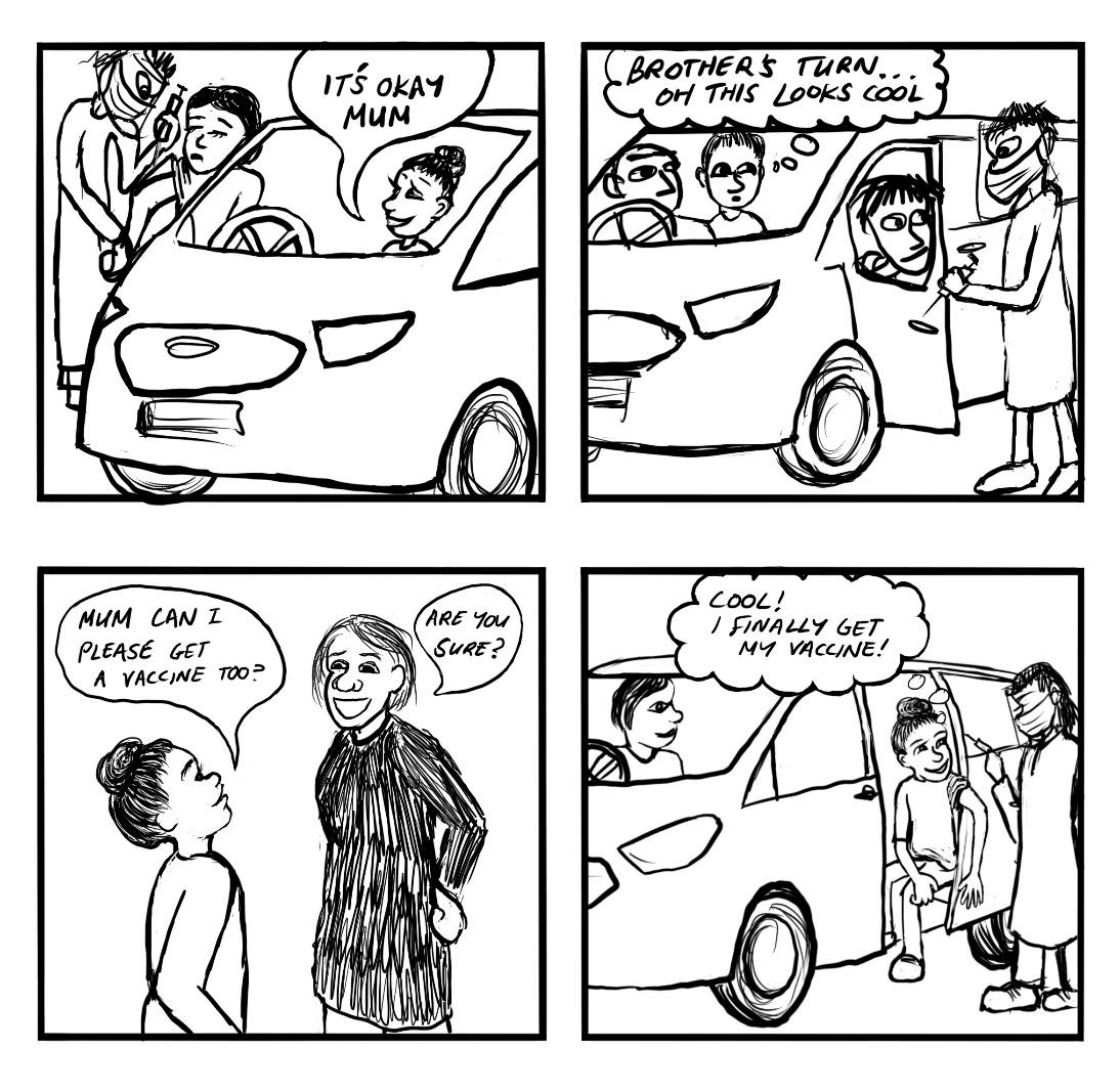 I learned all this when I talked to McKenzy over Zoom and together we drew a comic strip of her pandemic experience. She chose the topic “when I decided to take my vaccination shot” and directed me how to represent her story. At the time, she was still waiting for her second dose and also the results of a Covid test she’d taken the day before. “I really wanted to go back to school to play my game with all my friends,” she said. “Then I realised that none of my friends are at school.” Most of her class were either sick with Covid-19 or quarantining.
