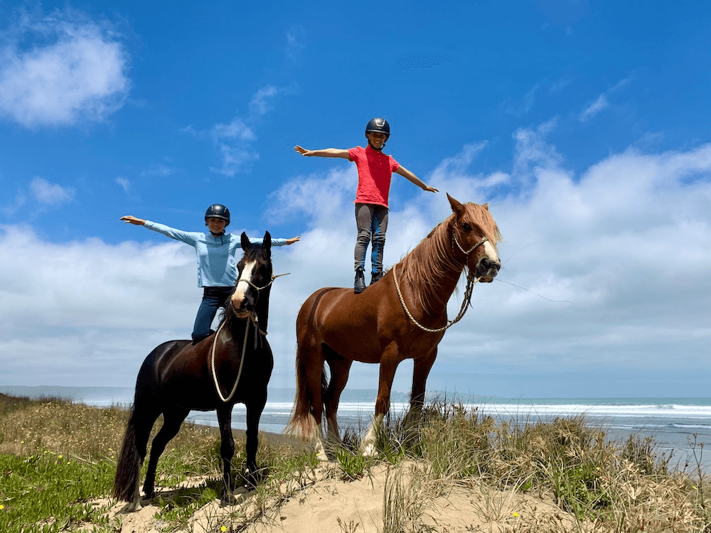 Since 2019, she’s lived with him in Ahipara, running beach treks and teaching people – mostly kids, up to 30 a week – how to ride.
