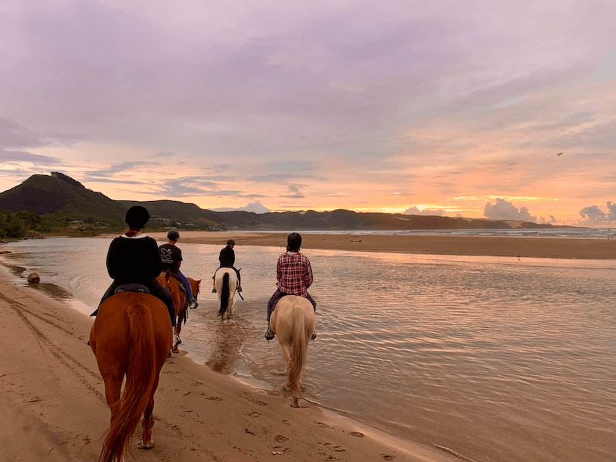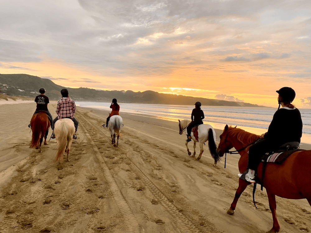 Standing on my dad’s deck on the beachfront of Te-Oneroa-a-Tōhē (Ninety Mile Beach), I’m greeted by a majestic scene. A solemn string of horses treks in unison along the sand, backlit by the descending sun. The riders are bareback, serene. The procession loops from the ocean’s edge to the estuary in front of my dad’s house, the water surface lightly rippling with the pounding of hooves.