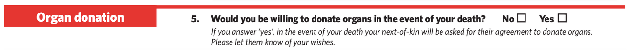 Coincidentally, while I am researching this story, I need to renew my driver licence. For many of us, this is the only time we are explicitly asked about organ donation. Upstairs inside the local AA office, I fill in the licence paperwork, stalling on question five. Would you be willing to donate organs in the event of your death? It’s a simple yes or no. Actually, the option to tick ‘no’ is before ‘yes’. I look around for a pamphlet, a poster, some kind of information, but there is none. The two staff members are busy. Underneath the question is written: If you answer ‘yes’, in the event of your death your next-of-kin will be asked for their agreement to donate organs. Please let them know of your wishes. I bite the end of the ballpoint pen, question five, no or yes?
