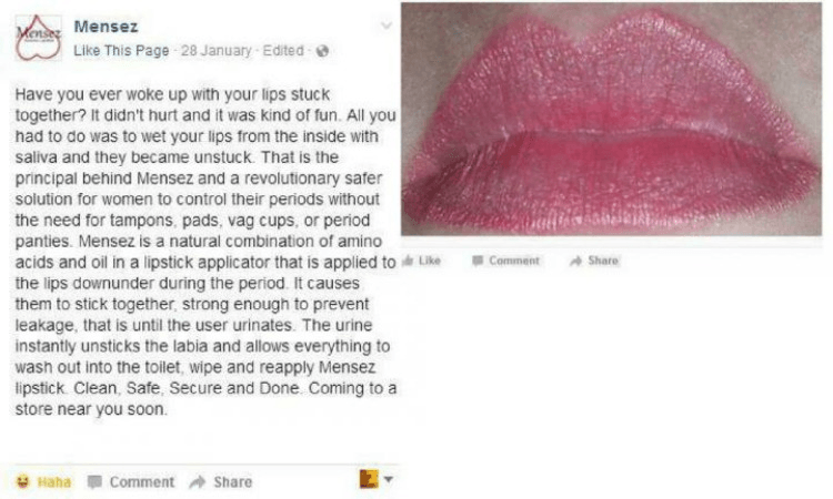 Bleeders, palm off your pads, trash your tampons and shoot your mooncup straight to the moon. There’s a brand new innovation in time-of-the-month technology called Mensez, a lipstick for your other set of lips that seals everything up down there like an Action Man when you are on your period, until you wee and all the blood evacuates somehow. Sorry, not sorry for the details – and a brief warning that things are going to get a lot more gnarly from here.