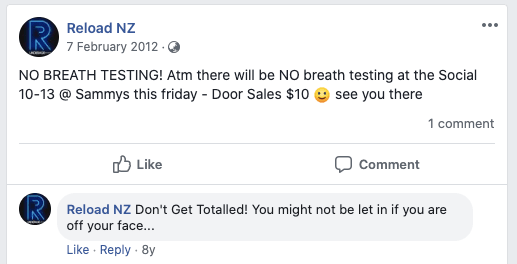 However, the attendees The Spinoff talked to for this story didn’t recall being breath-tested at 18UNDER events. Posts on an events page for Reload, an 18UNDER sub-brand, advertised specifically that there was no breath-testing at the door. These posts were deleted after The Spinoff contacted the former 18UNDER employee.