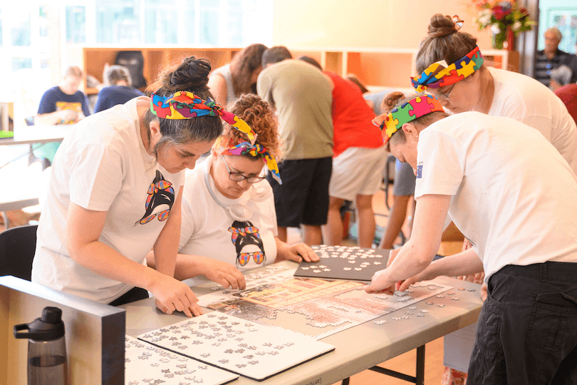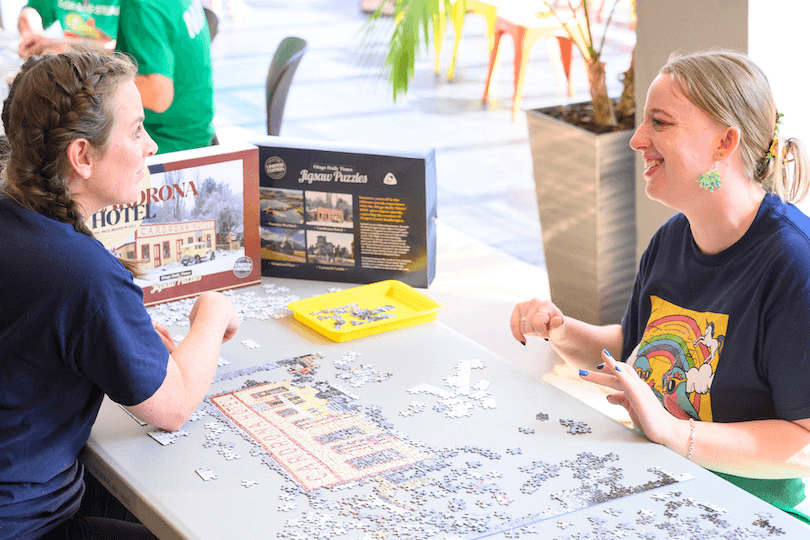 It’s a stark contrast to the action in the corner, where Team Bird and Chook have laid out their snacks (carrots, cake and chocolate) and are laughing their way through their puzzle. Best friends Toni Kennedy (Bird was a childhood nickname) and Kim Lammond (her mum calls her Chook) arrive wearing the matching T-shirts they had specially made for the event, a sartorial vision of birds, rainbows and unicorns. They both enjoy puzzling for its calming, mindful qualities, with Kim discovering that jigsaws helped to ease the anxiety she experienced during breast cancer treatment.