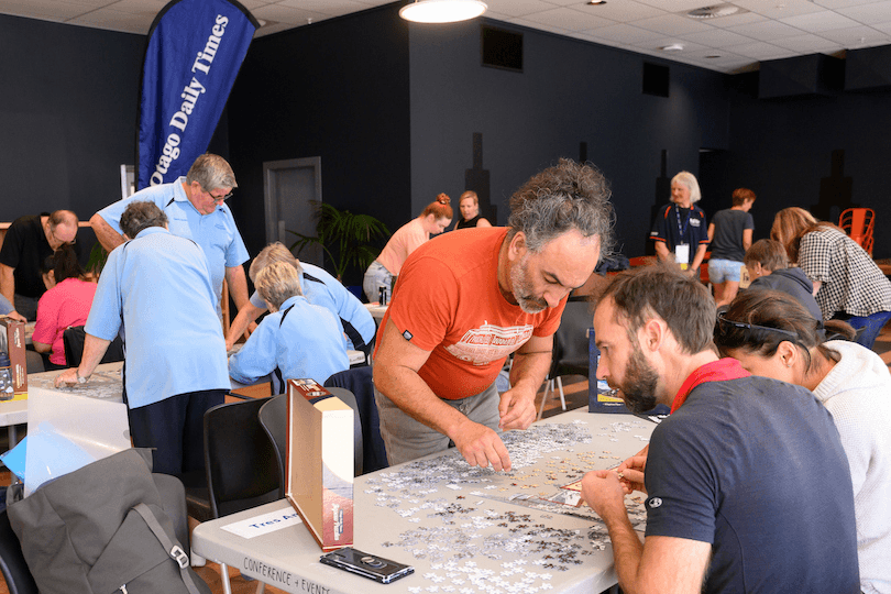 Now, it’s Dunedin’s turn. Over two days in the New Zealand Masters Games, jigsaw athletes are competing for glory in team and individual categories, sprinting to build a 1000-piece puzzle in a matter of hours. It’s the first time jigsaw racing has featured at the Dunedin games, after it debuted at the Whānganui Masters in 2021. Players filing into Dunedin’s vast jigsaw arena range in age from their 20s to their 70s, travelling from as far as Auckland’s New Lynn to compete. In the world of speed puzzling, jigsaws aren’t just for the old or boring – and nor for the faint of heart.