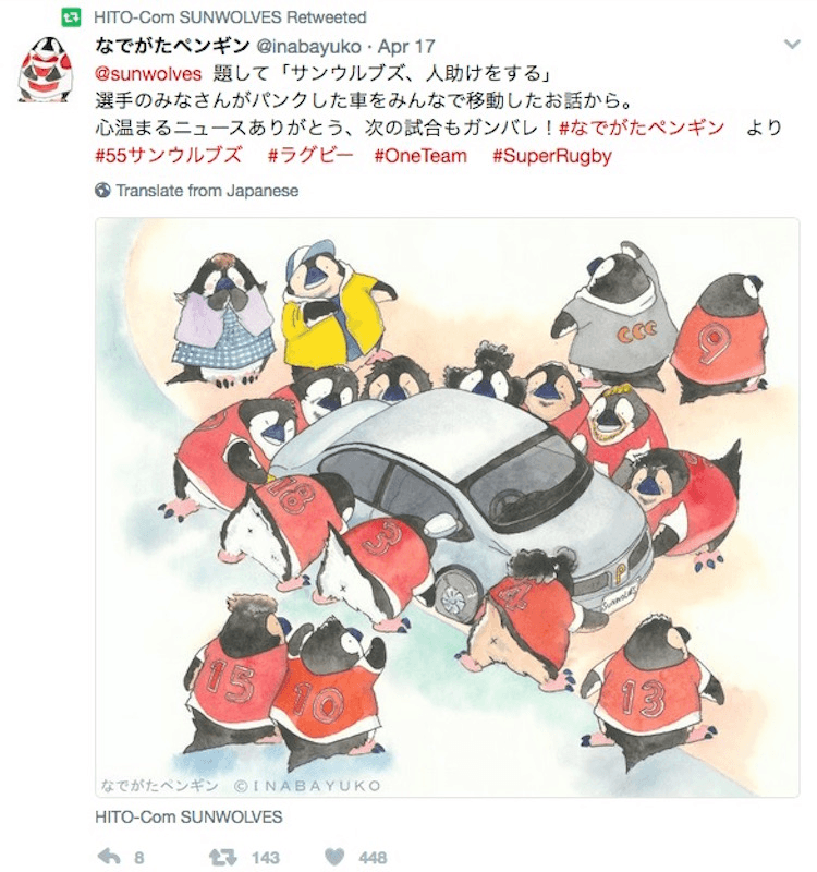 The Tokyo watercolourist is prolific, sharing a new painting on Facebook, Twitter or Instagram every couple of days. The Sunwolves Twitter account retweeted one of them last week. It captured the viral moment the team picked up a broken-down car and shuffled it the side of the road on Auckland’s Tamaki Drive. In the painting, several penguins in rugby jerseys crowded around the stricken vehicle. Its licence plate read ‘SUNWOLVES’.