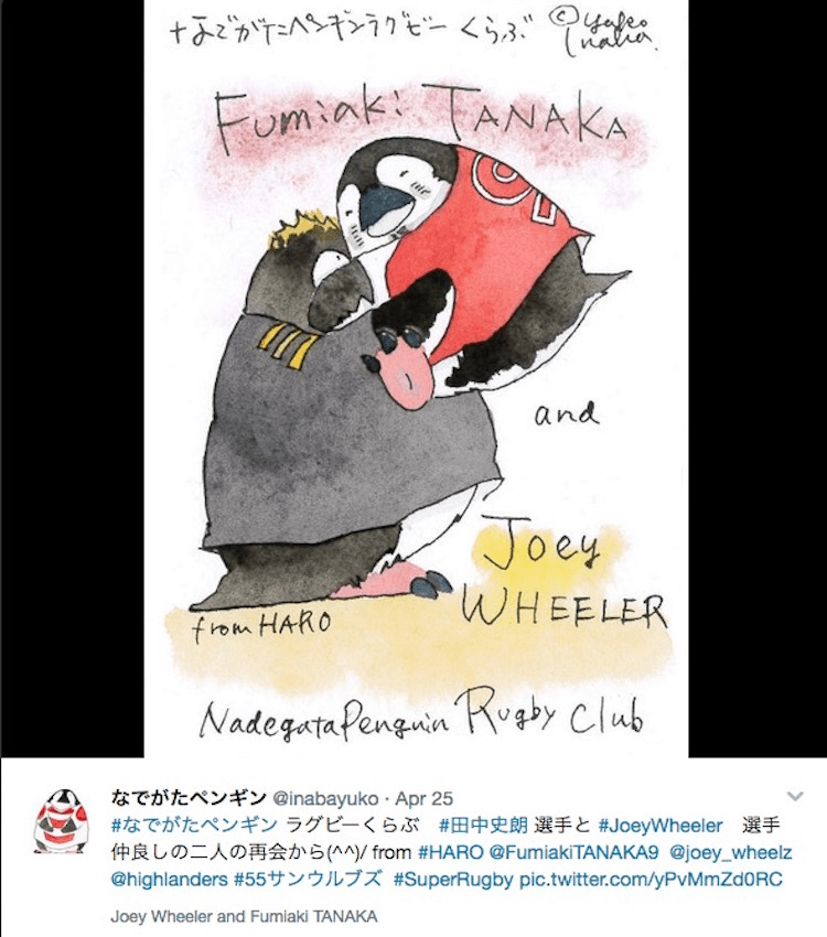 I’m no art expert, but I know what I like – and I bloody loved this painting. Digging a little further revealed a veritable treasure trove of other rugby players painted as penguins. Inaba’s Twitter account featured a handful of individual Sunwolves players’ penguin portraits. On Instagram, there was a watercolour of veteran lock Hitoshi Ono holding an enormous bottle of sake. Another depicted a penguin weeping with joy in front of the TV after watching Japan’s Brave Blossoms beat South Africa in the 2015 Rugby World Cup.