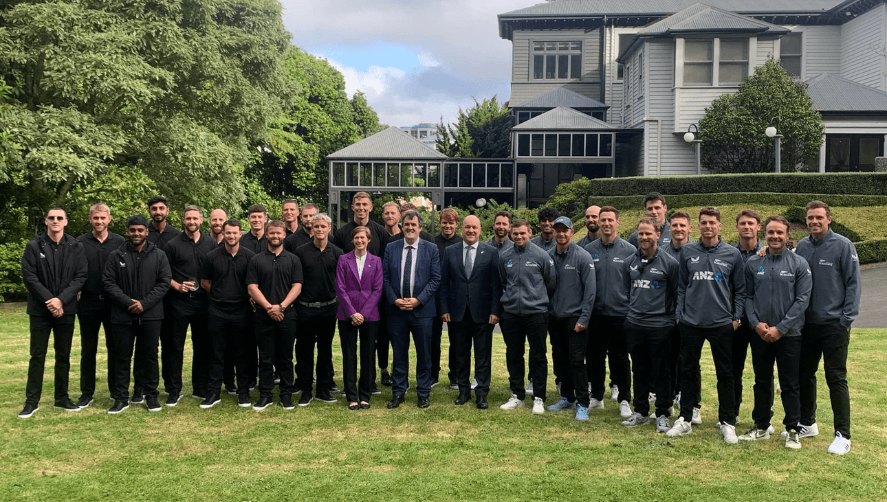 - After the individual photos are finished, the crowd gathers on the back lawn. Minister of sport Chris Bishop takes the podium while Luxon engages in horseplay with Tom Latham, grabbing the New Zealand captain’s shoulders and jokingly hiding behind him. Bishop keeps it short: “It’s never a good idea to keep the prime minister waiting.” He introduces Luxon as “the right honourable prime minister and, most importantly, a huge cricket fan”.