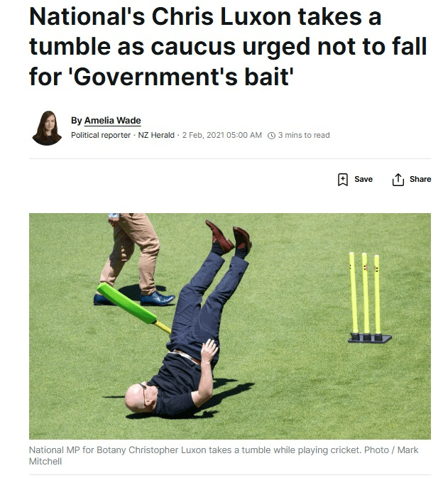 However, Luxon has been photographed playing cricket on at least two occasions: earlier in the year at an event with the Australian team and at a National Party retreat in 2021, which generated this amazing headline and photo in the NZ Herald.